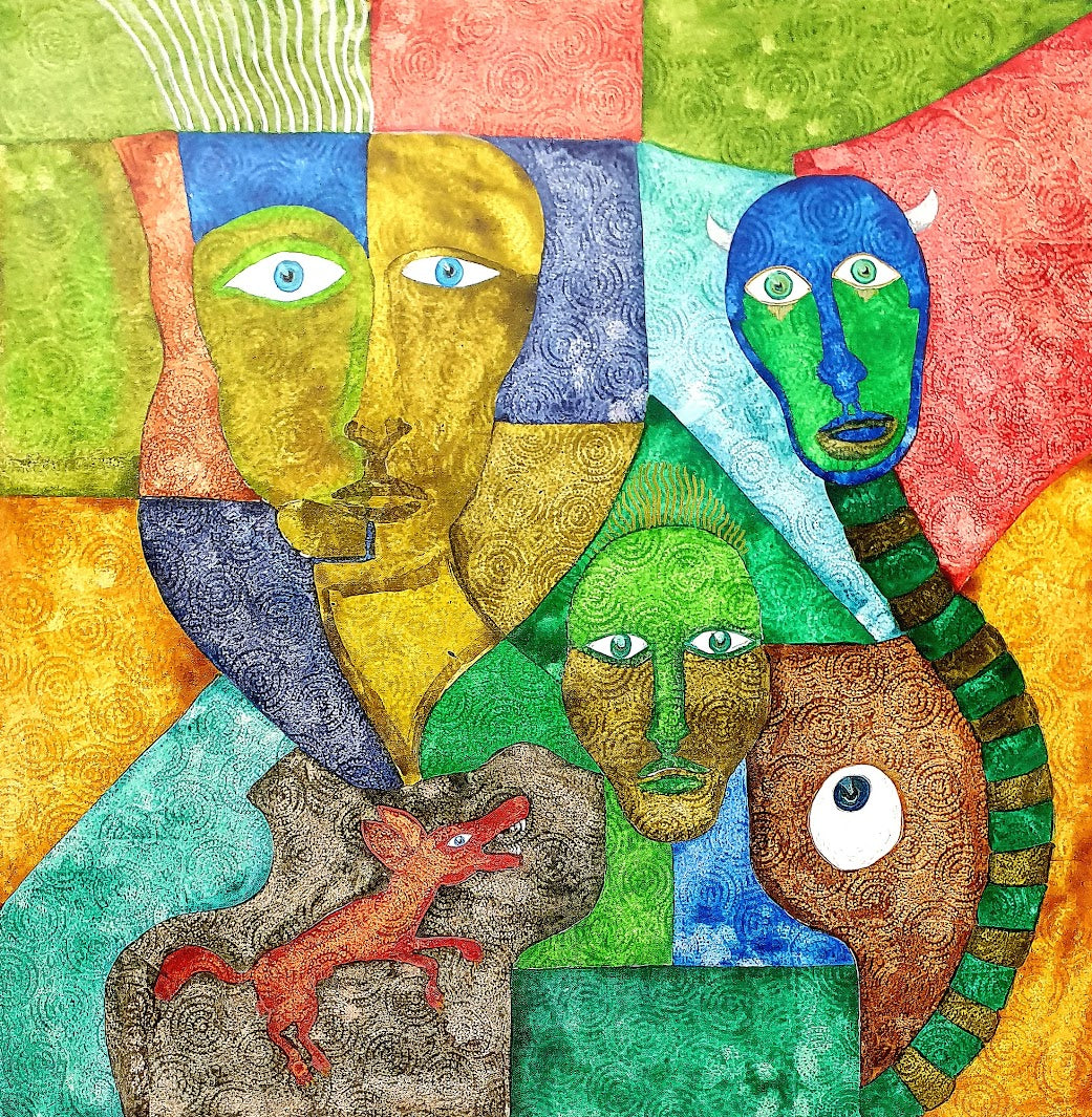 Centralt dominerer et gyldent ansigt med et roligt, blåt blik, mens mindre skikkelser og en blå, hornet væsen med en langstrakt hals skyder frem fra de skarpt opdelte farvefelter. Under dem løber en lille, rødlig hund gennem et gråligt landskab, hvilket tilføjer en jordbunden energi til de ellers drømmeagtige og svævende portrætter.