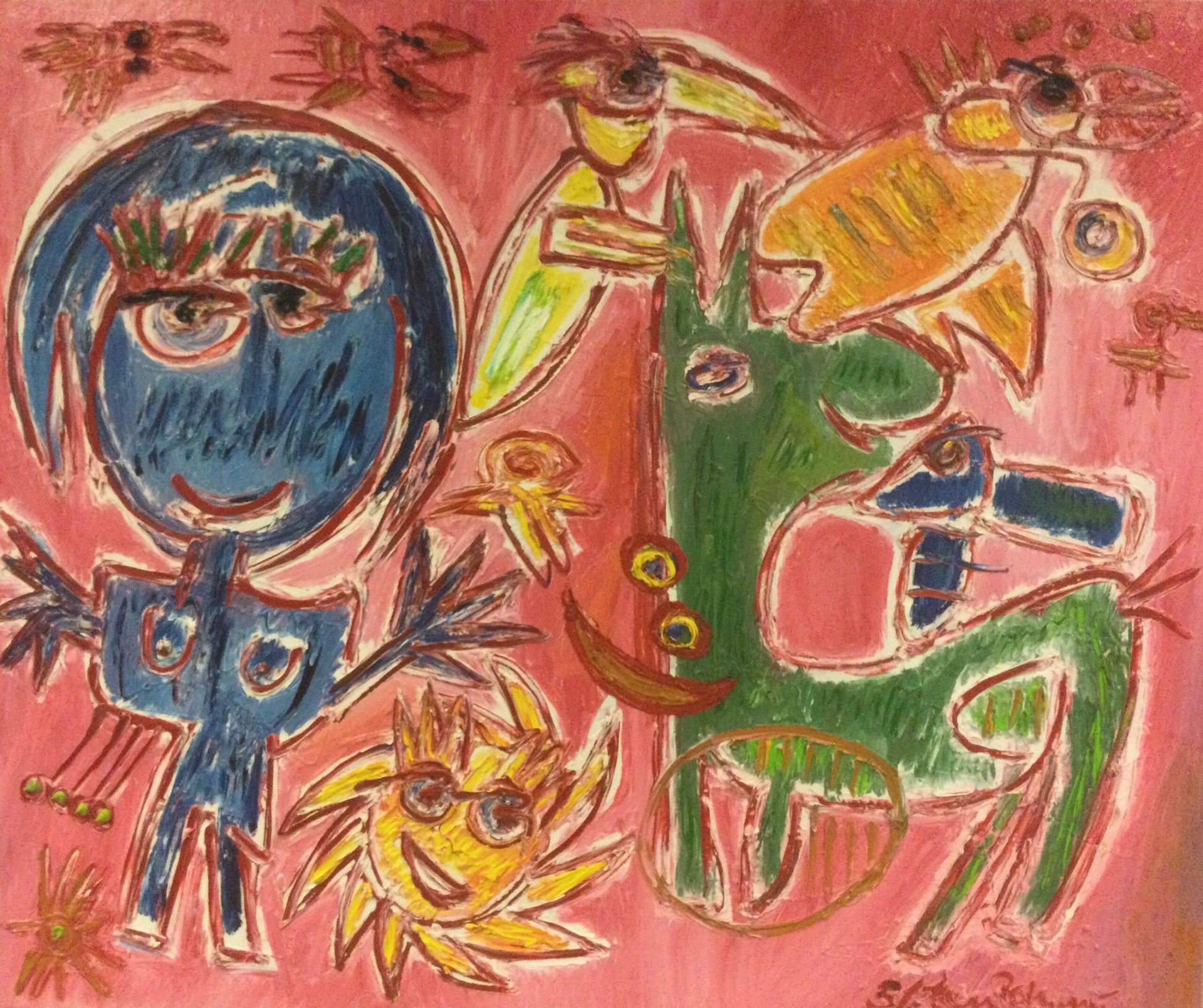 Til højre er der en stor, grøn figur af et dyr, der ligner en hest eller et muldyr. Over hesten er en orange fugl og en gul fugl.